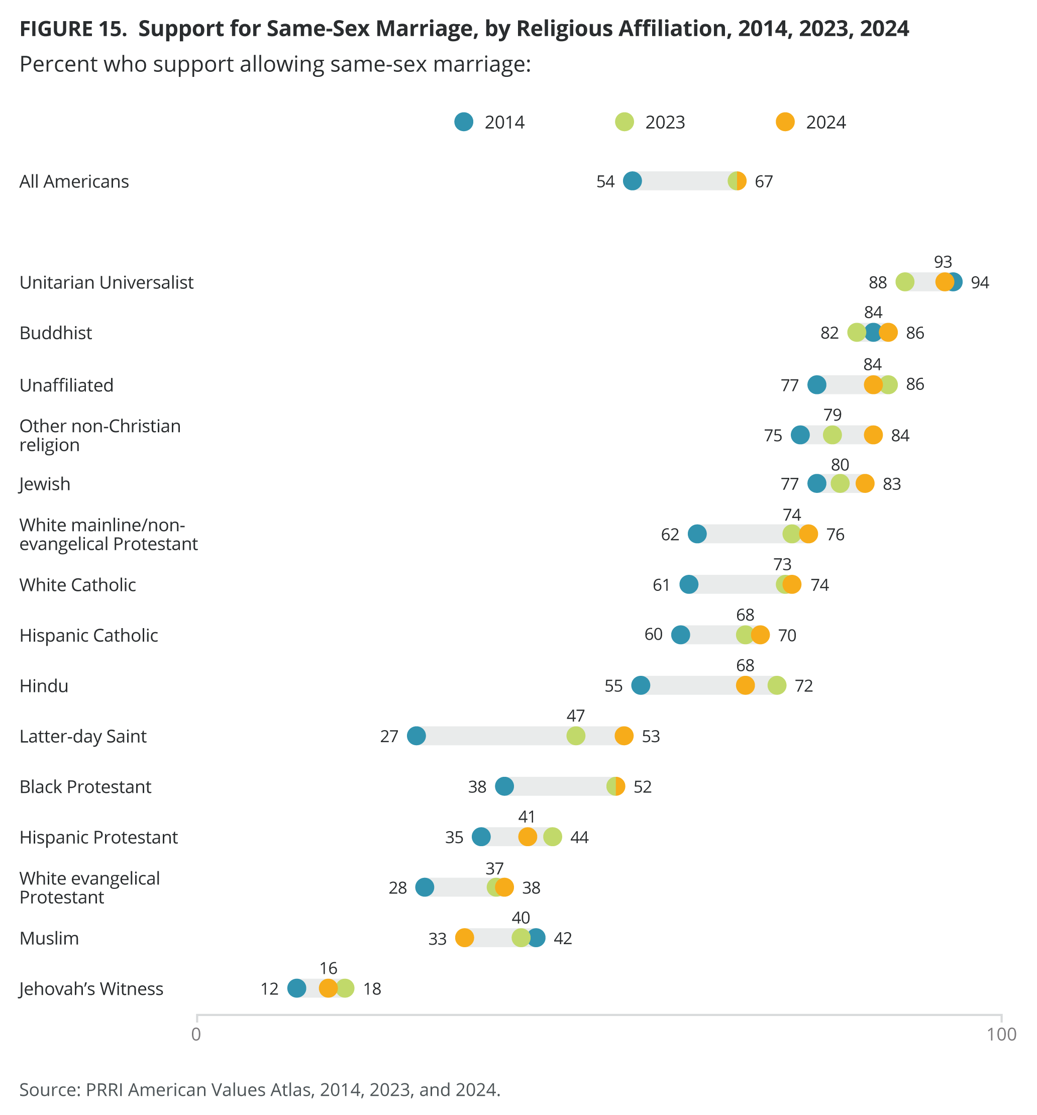 Take same sex-marriage. While support has increased among virtually everyone else (e.g. 83% of American Jews, up from 80% in 2023), it has plummeted among American Muslims, from 40% down to 33%.
