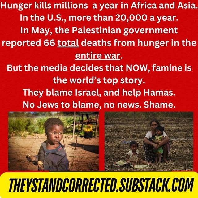 So, to recap: Hunger has been killing millions, particularly in African and Asian nations, but not in Gaza. Yet the Times appears to have put the majority of its focus on this issue into Gaza-related coverage — all while letting Hamas off the hook.